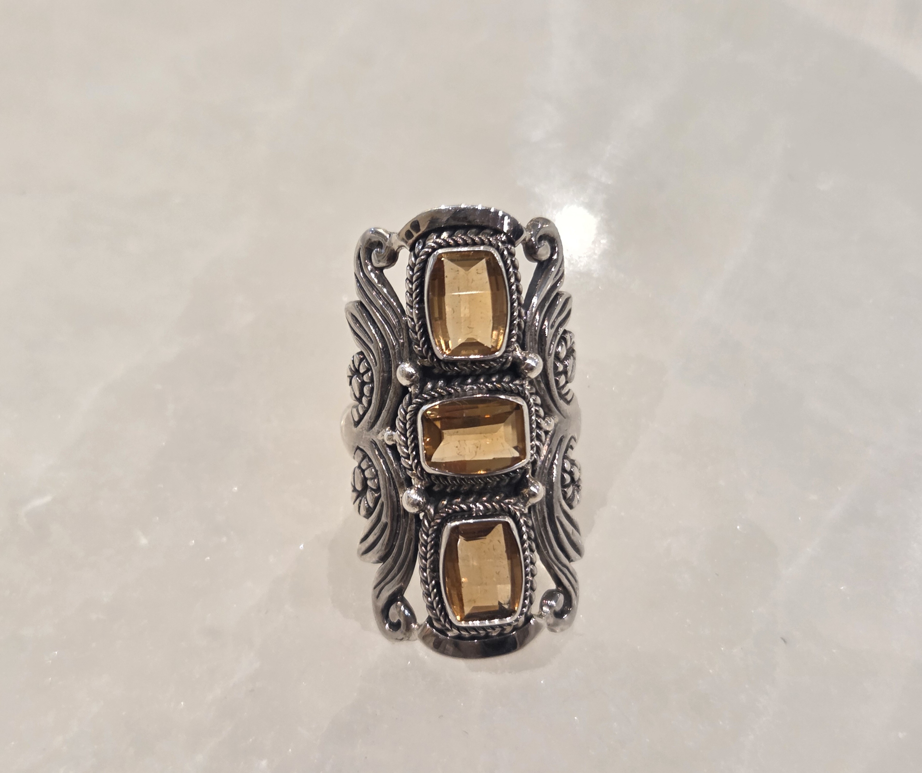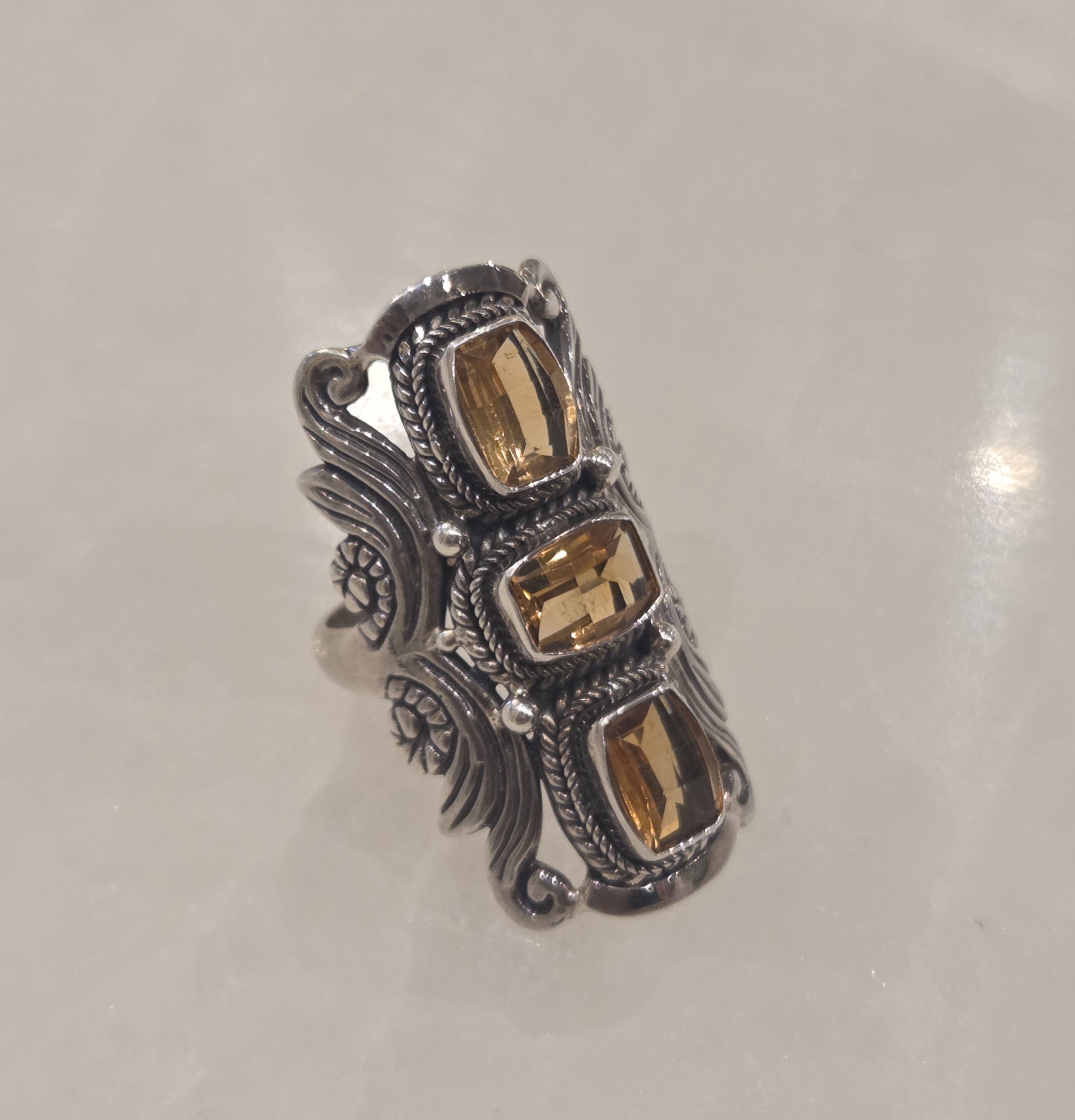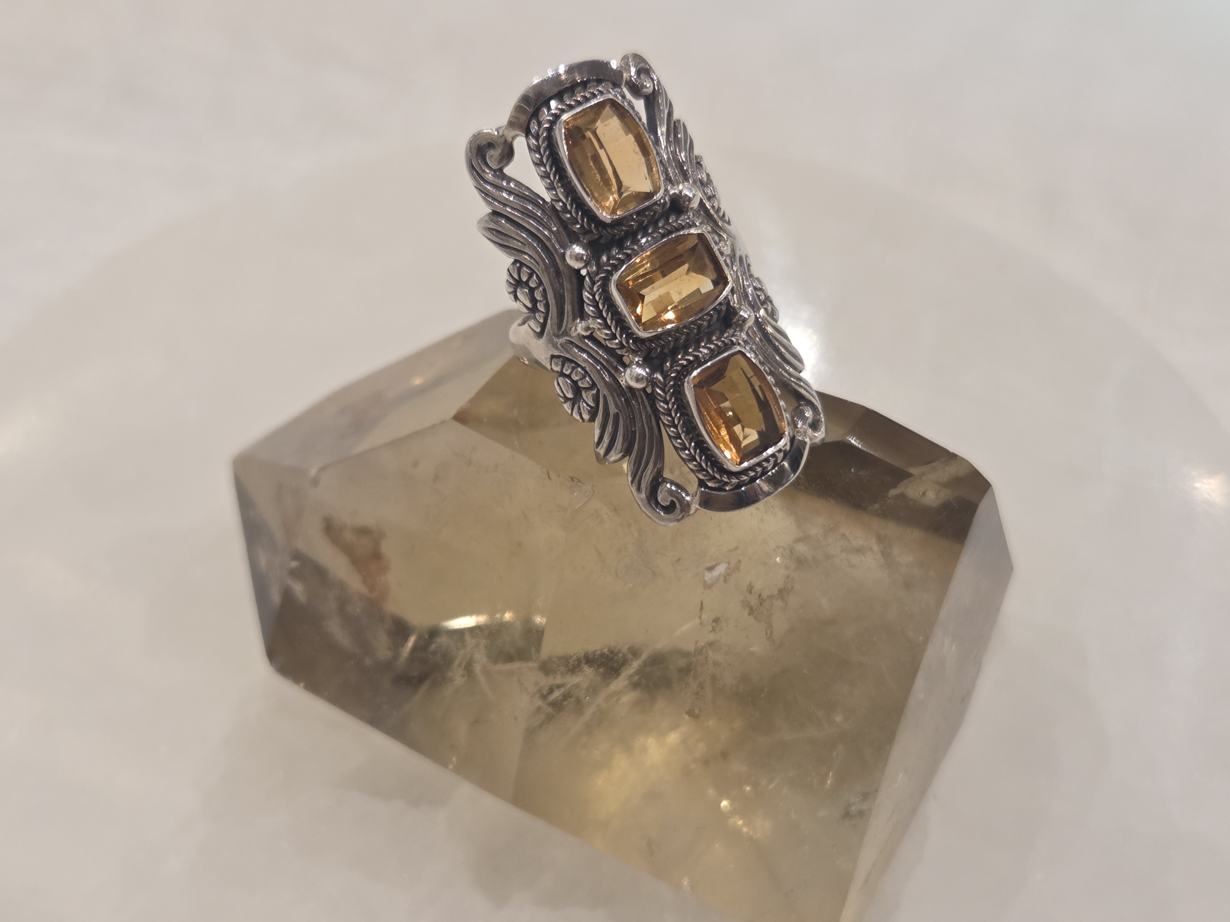 Triple faceted Citrine stone, 1.50x1inches size, in 925 Sterling Silver. Citrine is the transparent, pale yellow to brownish orange variety of quartz, Elegance and style in this beautiful ring.