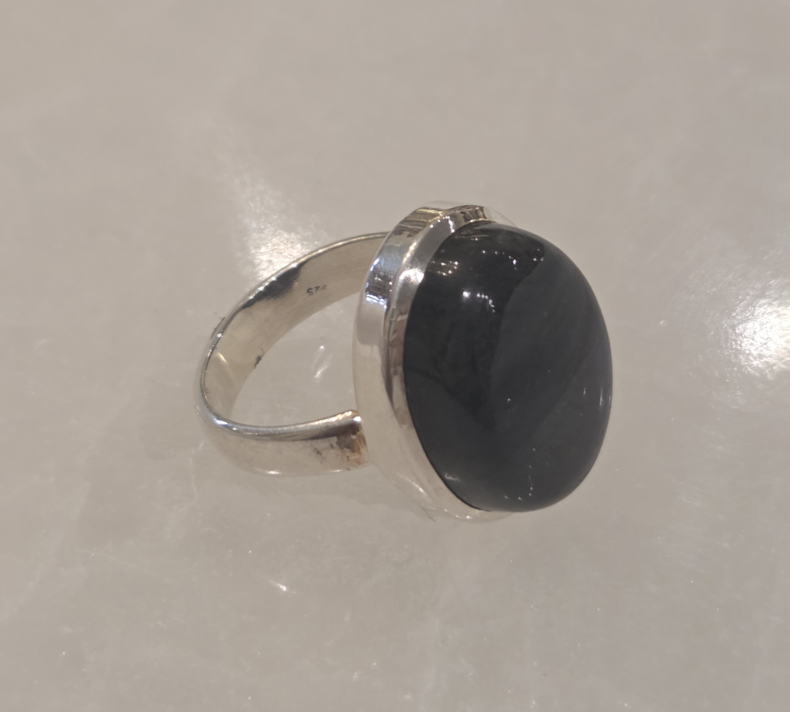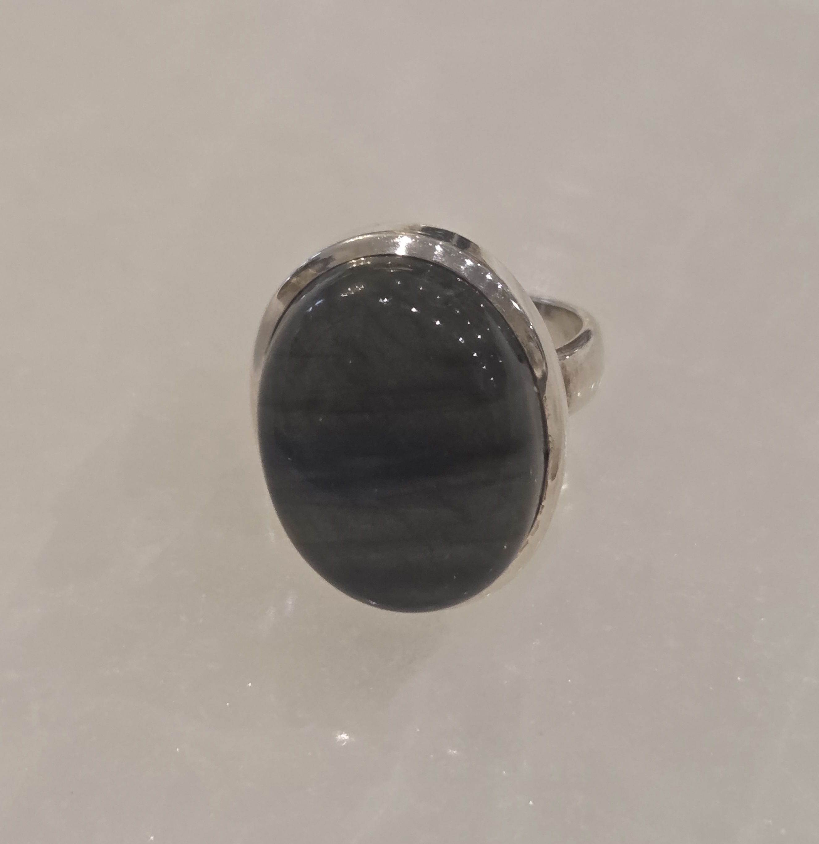 1.75x1.50 inch gem size, Blue flash Labradorite in 925 Sterling silver; this ring shows the mystics of the Blue Labradorite. This phenomenon occurs due to the presence of lamellar intergrowths within the stone, which diffracts light into different colors when viewed from various angles. The blue labradorite typically showcases shades ranging from pale blue to deep navy, with some stones even displaying flashes of green or gold.