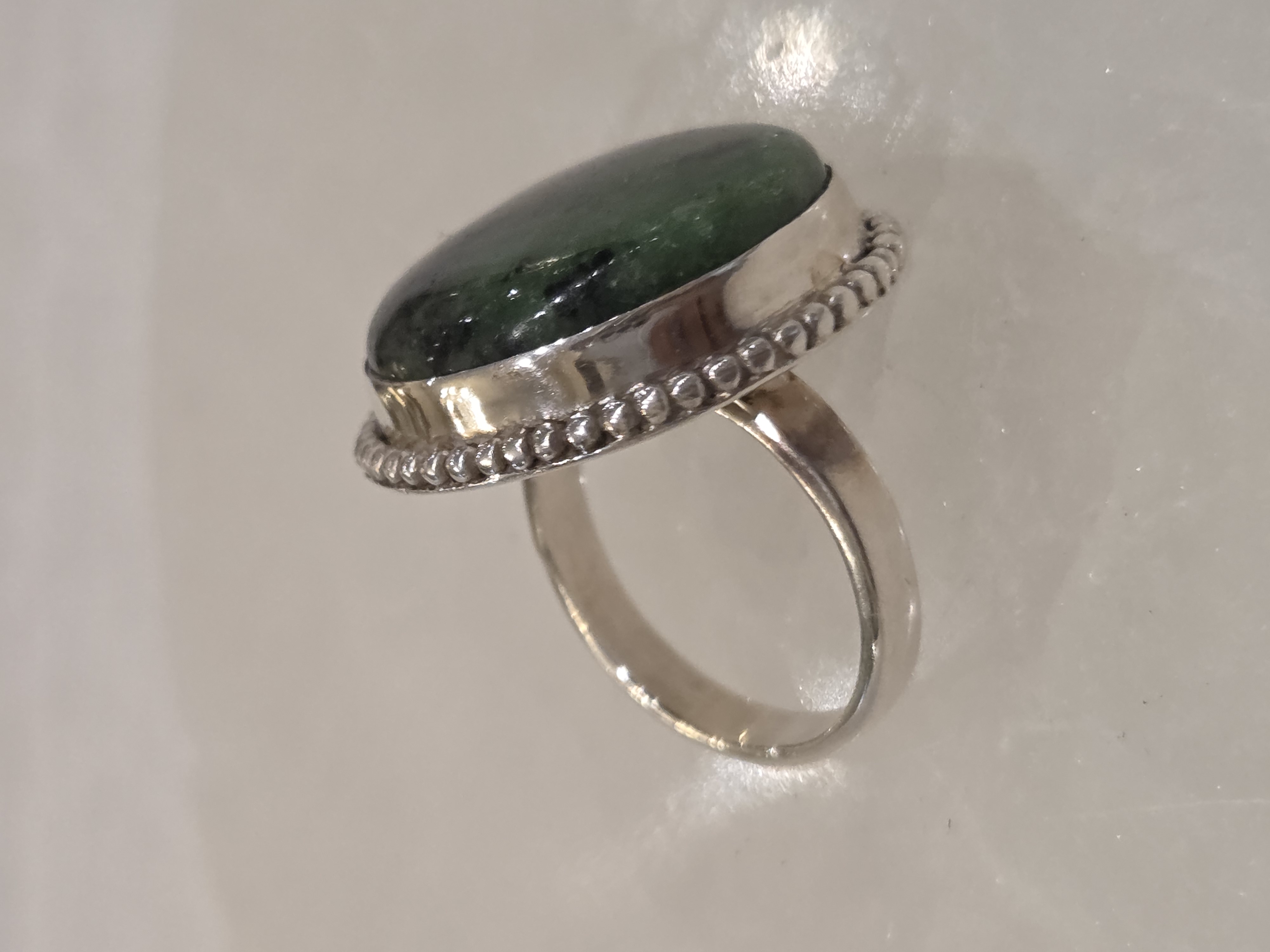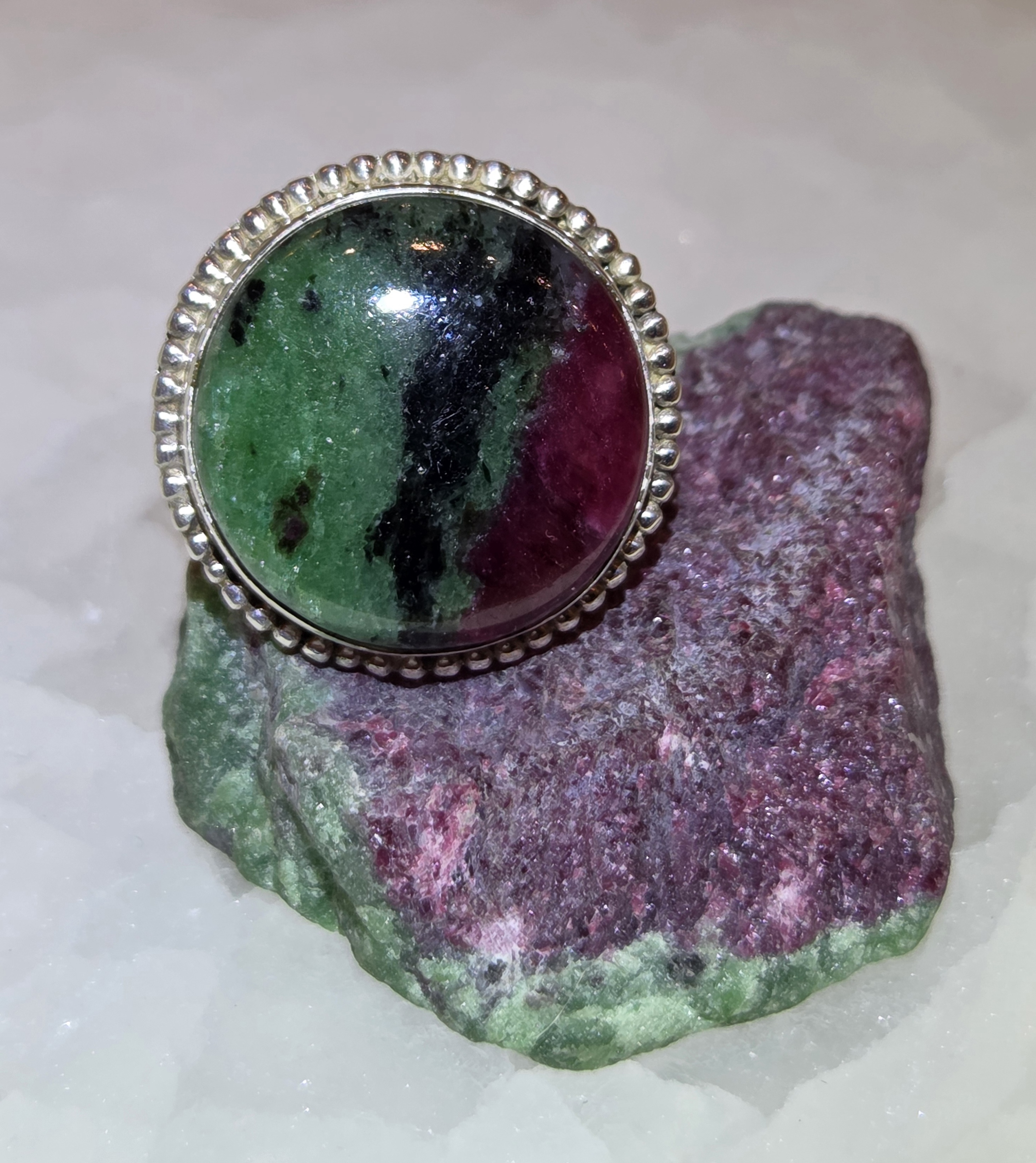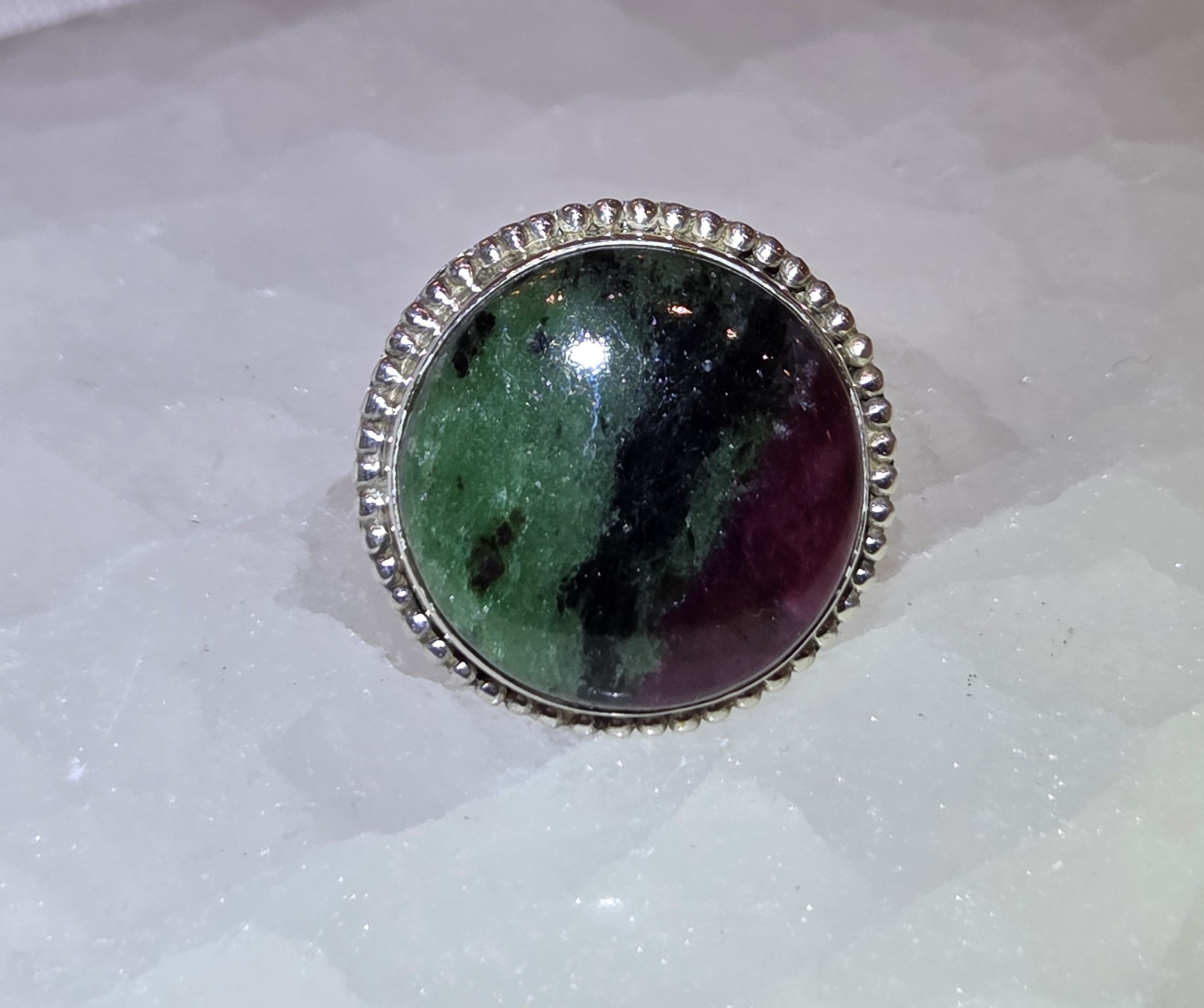 1inch circumference, in 925 Sterling silver. The stunning ruby zoisite stone, also known as anyolite, is a vibrant combination of green and red coloring, and is also a powerful source of positive energy.